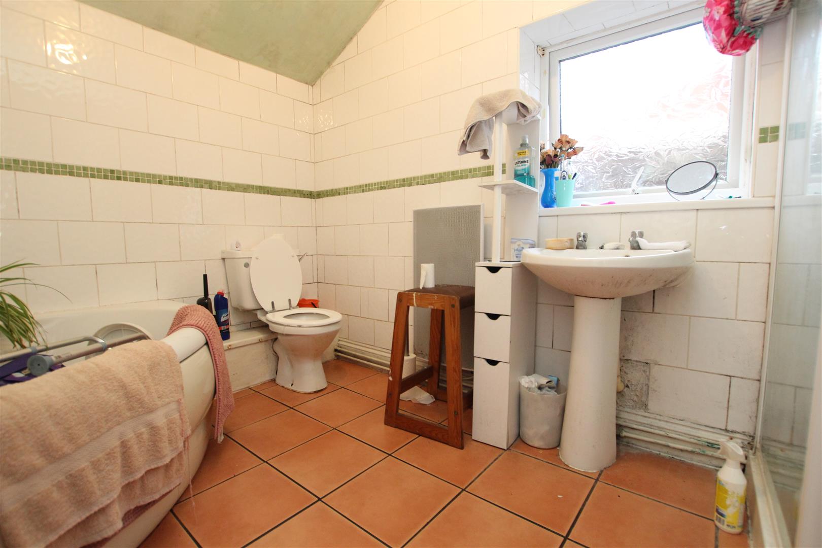 Smooth plastered ceiling, ceiling light point, obscure upvc double glazed window to the side aspect, wall mounted extractor fan, continuation of the ceramic glazed tiled flooring from the kitchen. Fitted with a four piece suite comprising pedestal wash hand basin, close coupled wc, large corner bath with an electric shower over.