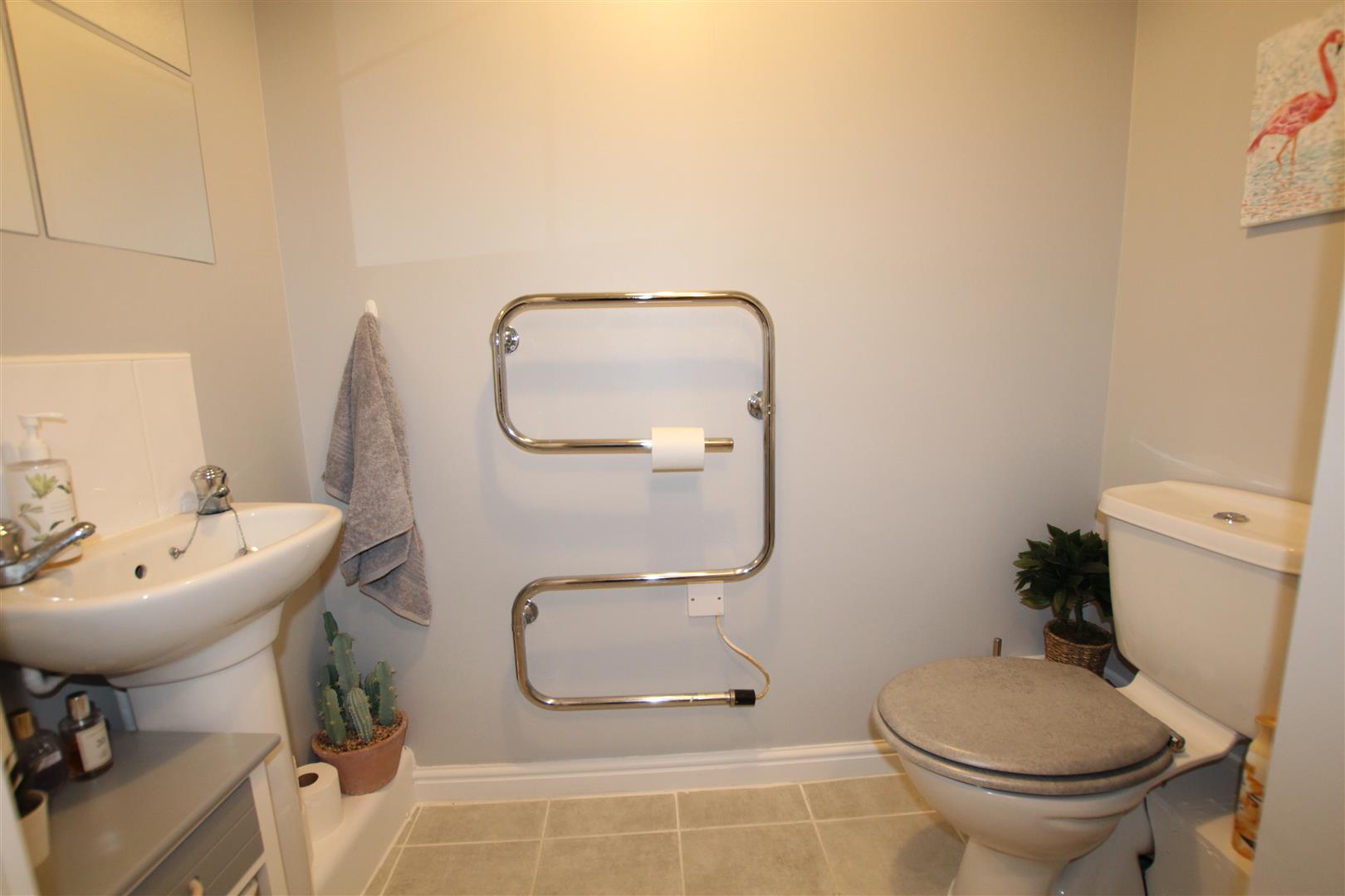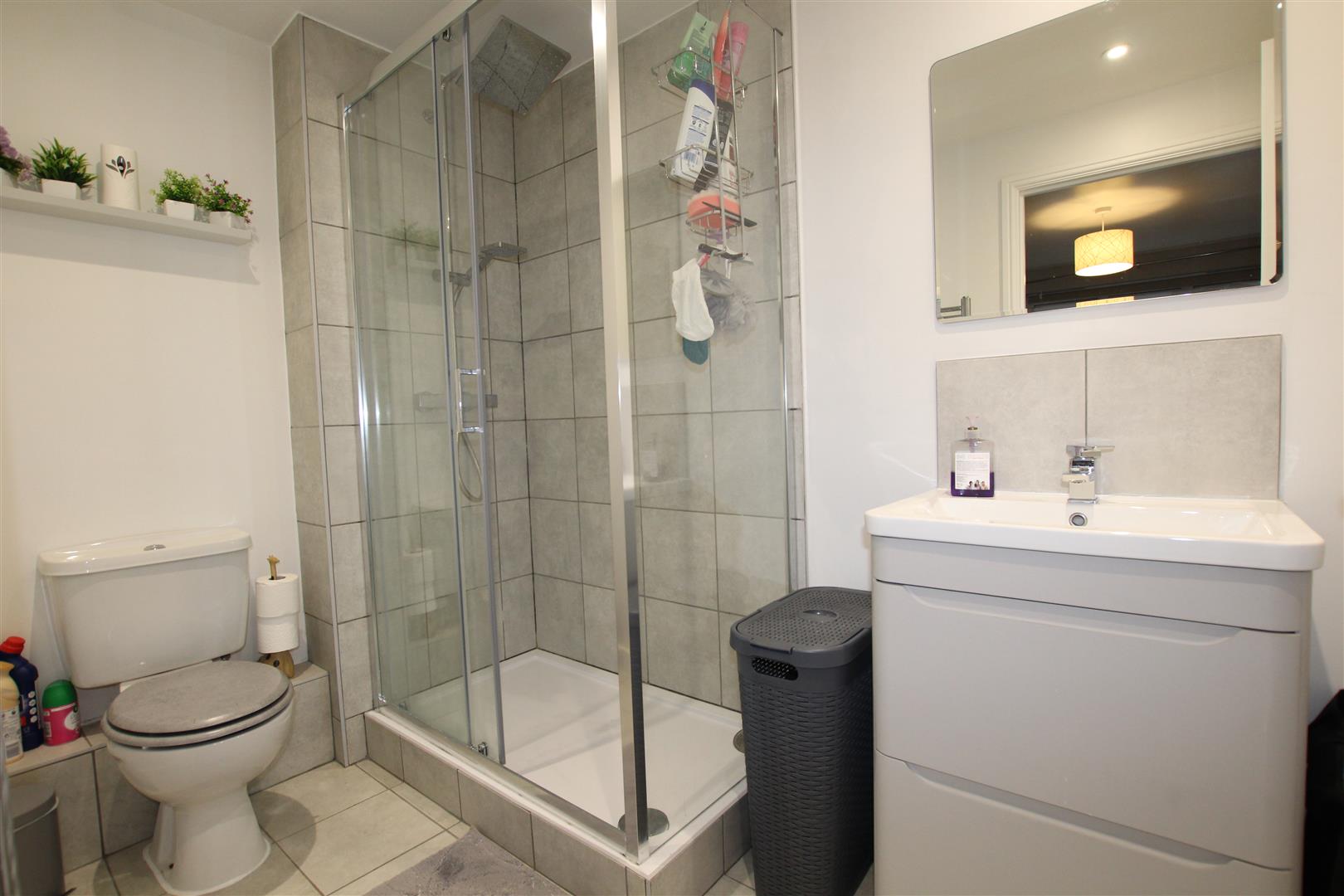 Fitted with a three piece suite comprising wash hand basin set upon a vanity unit providing useful additional storage, shower enclosure with thermostatic shower valves and dual head. Low level wc, heated towel rail and a shavers point.
