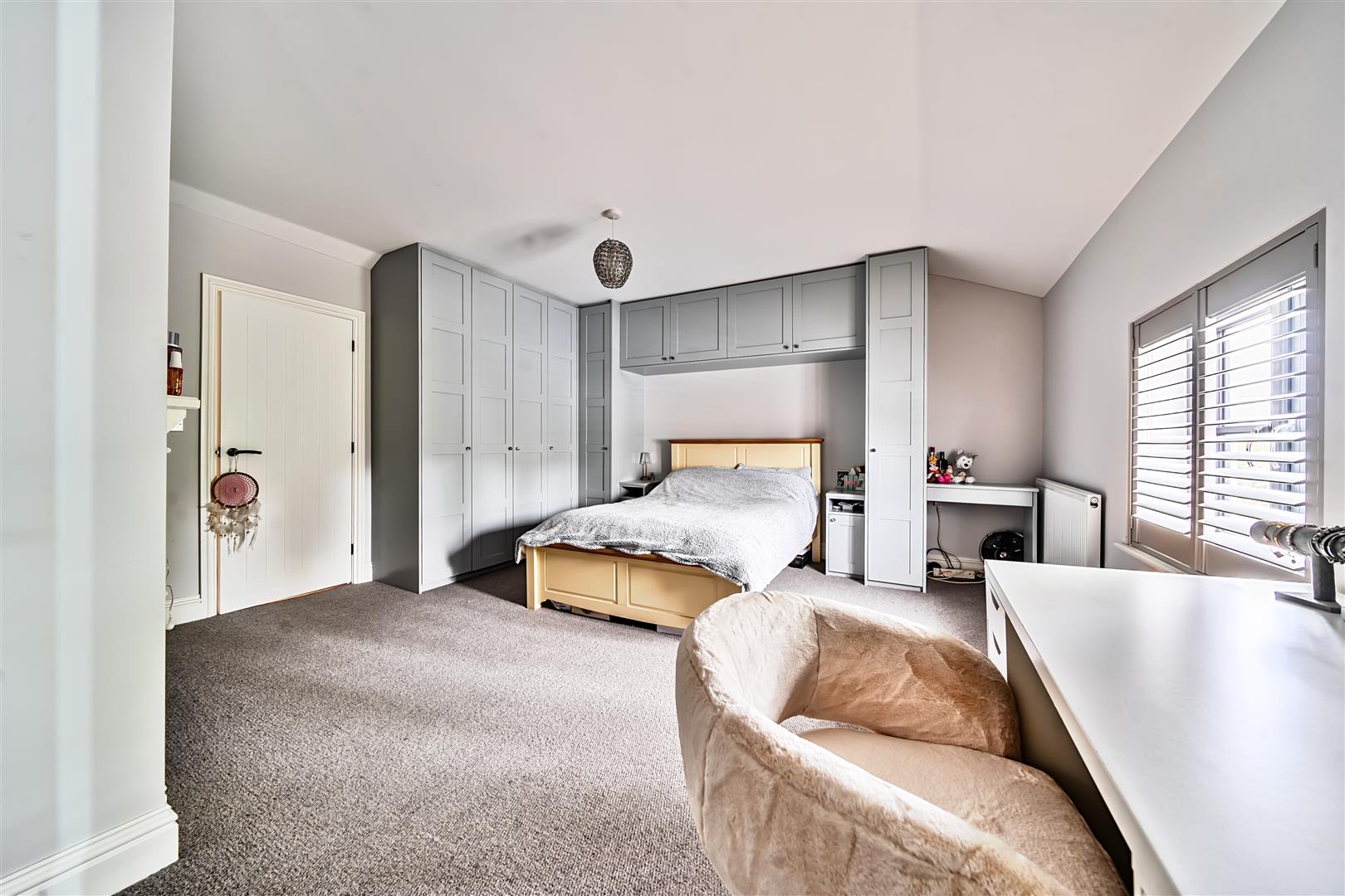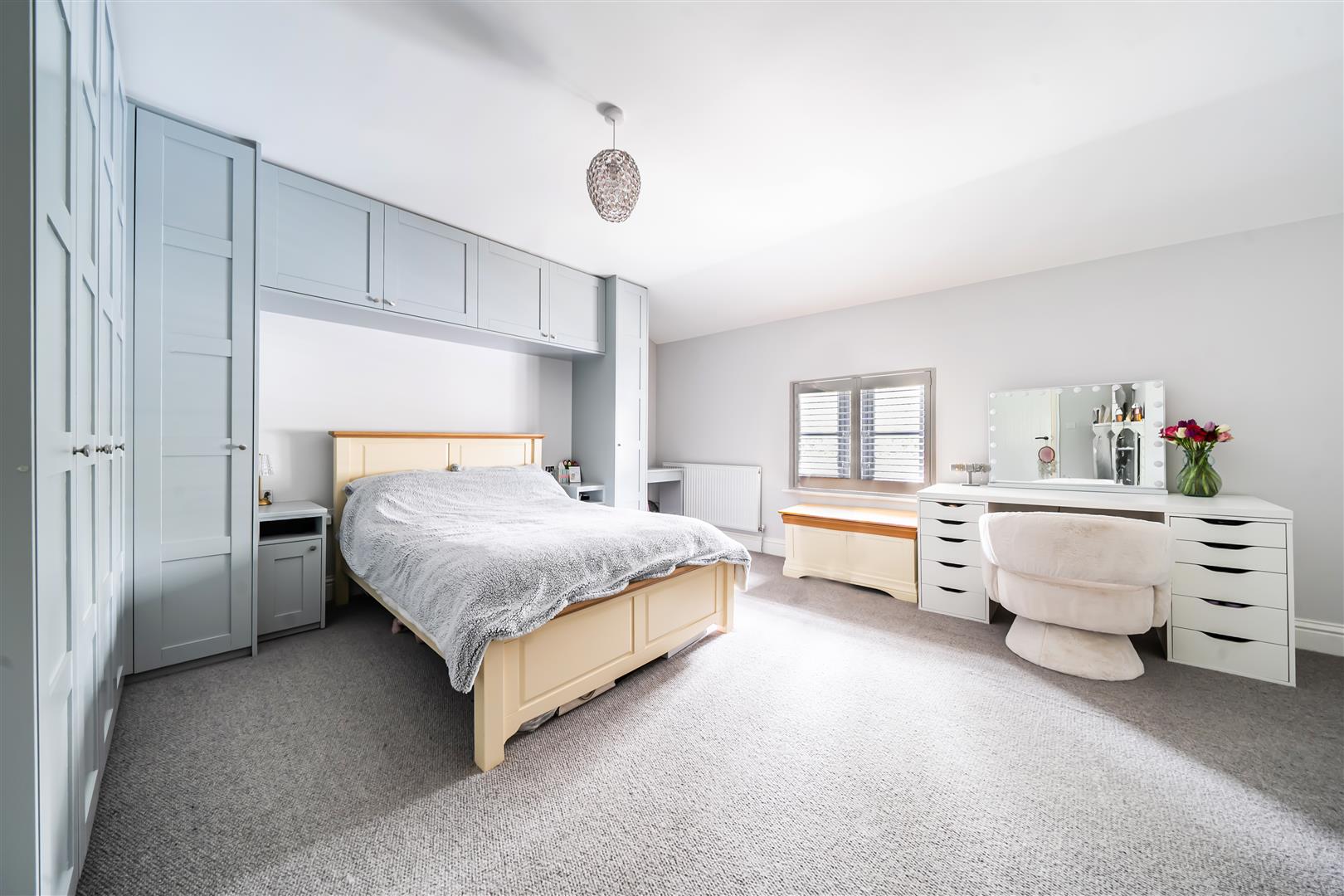 The room benefits from a range of fitted furniture including gantry cupboards, bedside and dressing tables.