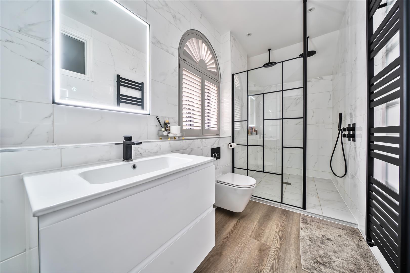 Smooth plastered ceiling, two LED downlighters, obscure upvc double glazed window to the front aspect, chrome heated towel rail, continuation of flooring from the entrance hallway.
