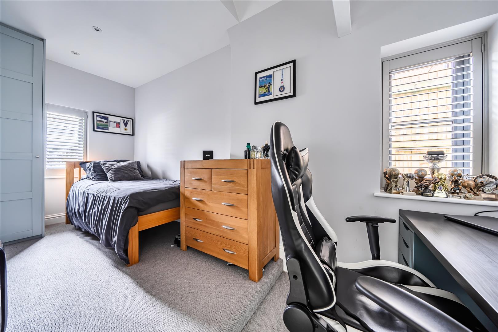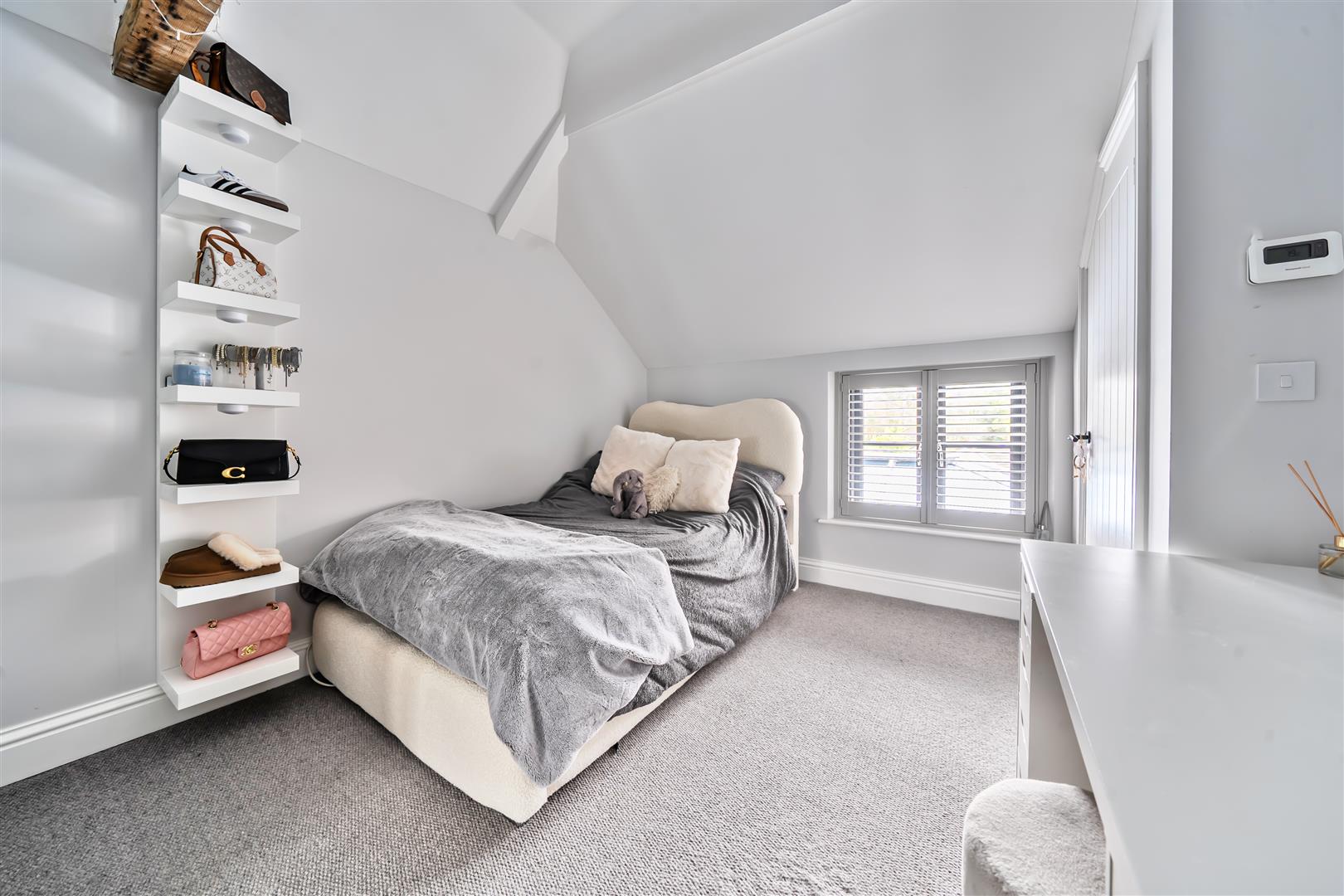 A versatile room currently utilised as a bedroom. With part vaulted ceiling, four downlighters, upvc double glazed window to the front and side aspect, provision of power points, single panel radiator. The room benefits from built in furniture providing hanging rail and shelving.