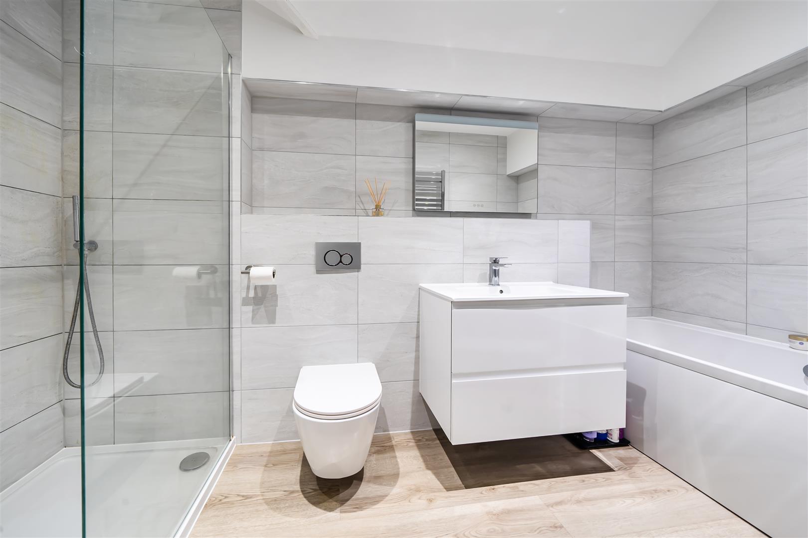 Fitted with a four piece suite comprising floating wash hand basin set within a vanity unit with storage below, concealed cistern wc with push flush, panelled bath with hand held shower attachment, shower enclosure with dual head.