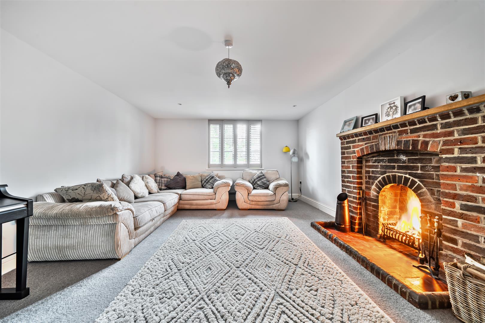 The room centres on an open fireplace with clay tiled hearth and an oak mantle over.