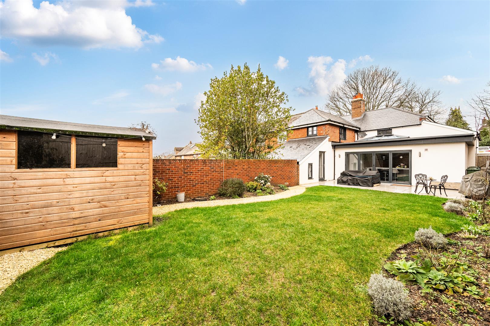From here the garden is principally laid to lawn with a path leading down the garden with flower beds.