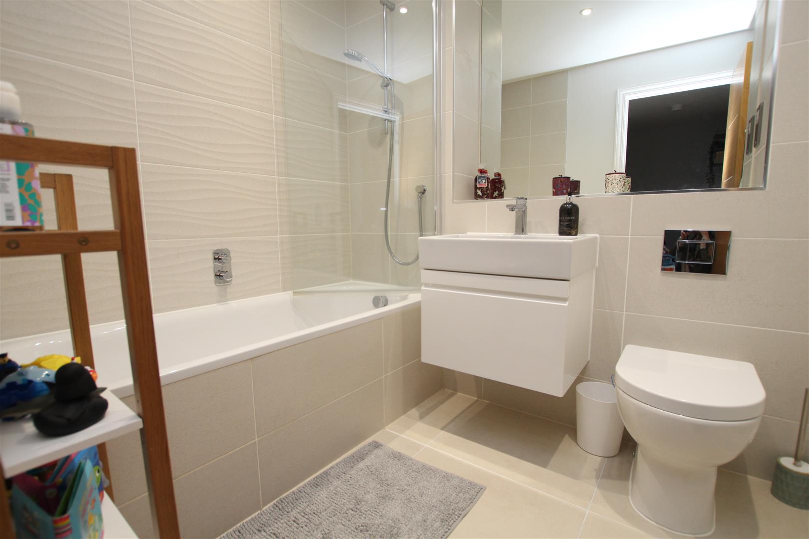 Fitted with a three piece white suite comprising wash hand basin set within a vanity unit, concealed cistern wc, bath with a glass and chrome shower screen over, tap-less fill bath and thermostatic shower valves.