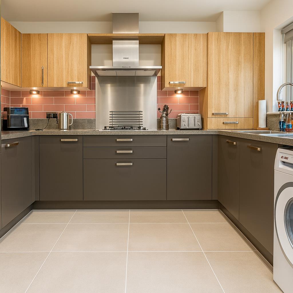 Smooth plastered ceiling, 8 LED downlighters, upvc double glazed window to the rear aspect and a pair of patio composite doors opening to the rear garden, double panel radiator, ceramic glazed tiled floor. Behind a wall mounted cupboard, conceals a 'Valliant' combination boiler. Space and plumbing for an automatic washing machine.