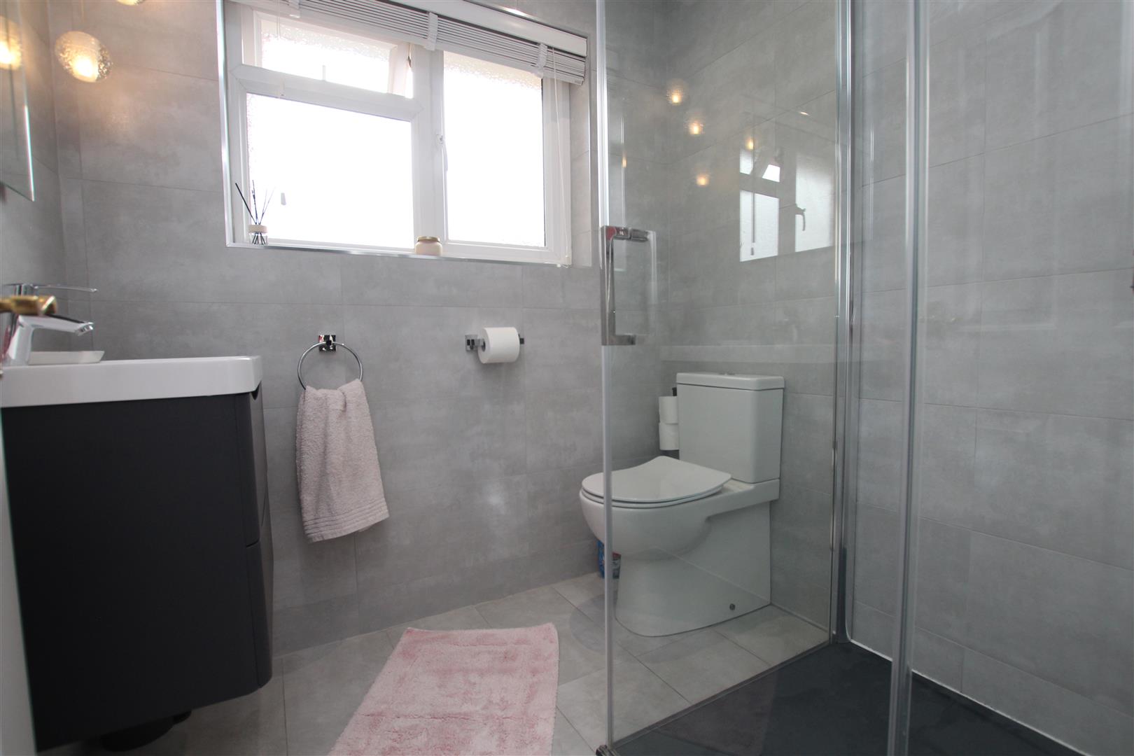 Smooth plastered ceiling, two downlighters and pendent lighting, obscure upvc double glazed window to the rear aspect, chrome heated towel rail. Floating wash hand basin with vanity drawer units, close coupled wc with dual push flush, walk in shower enclosure with a glass and chrome shower screen, thermostatic shower valves within and dual head.