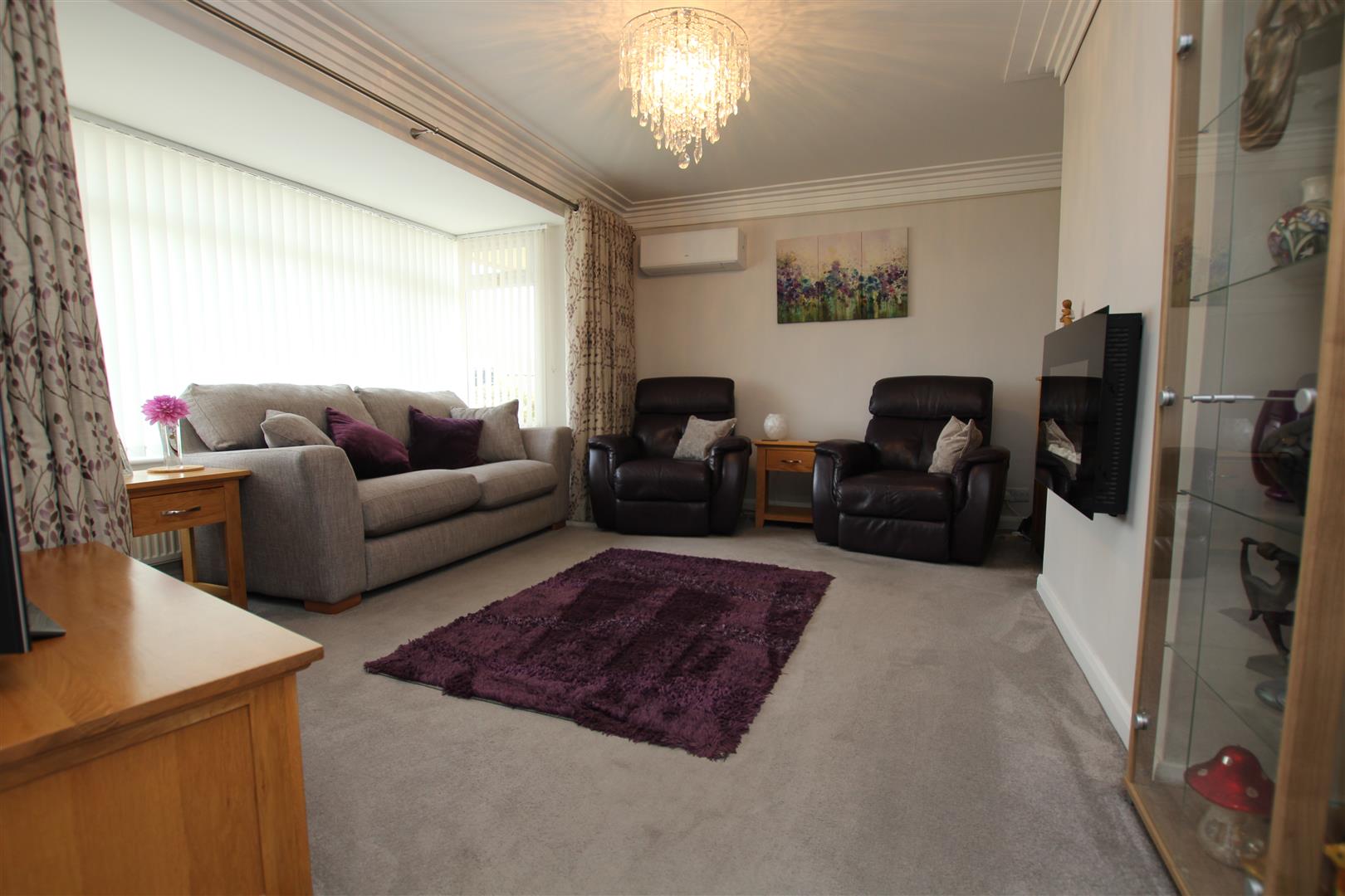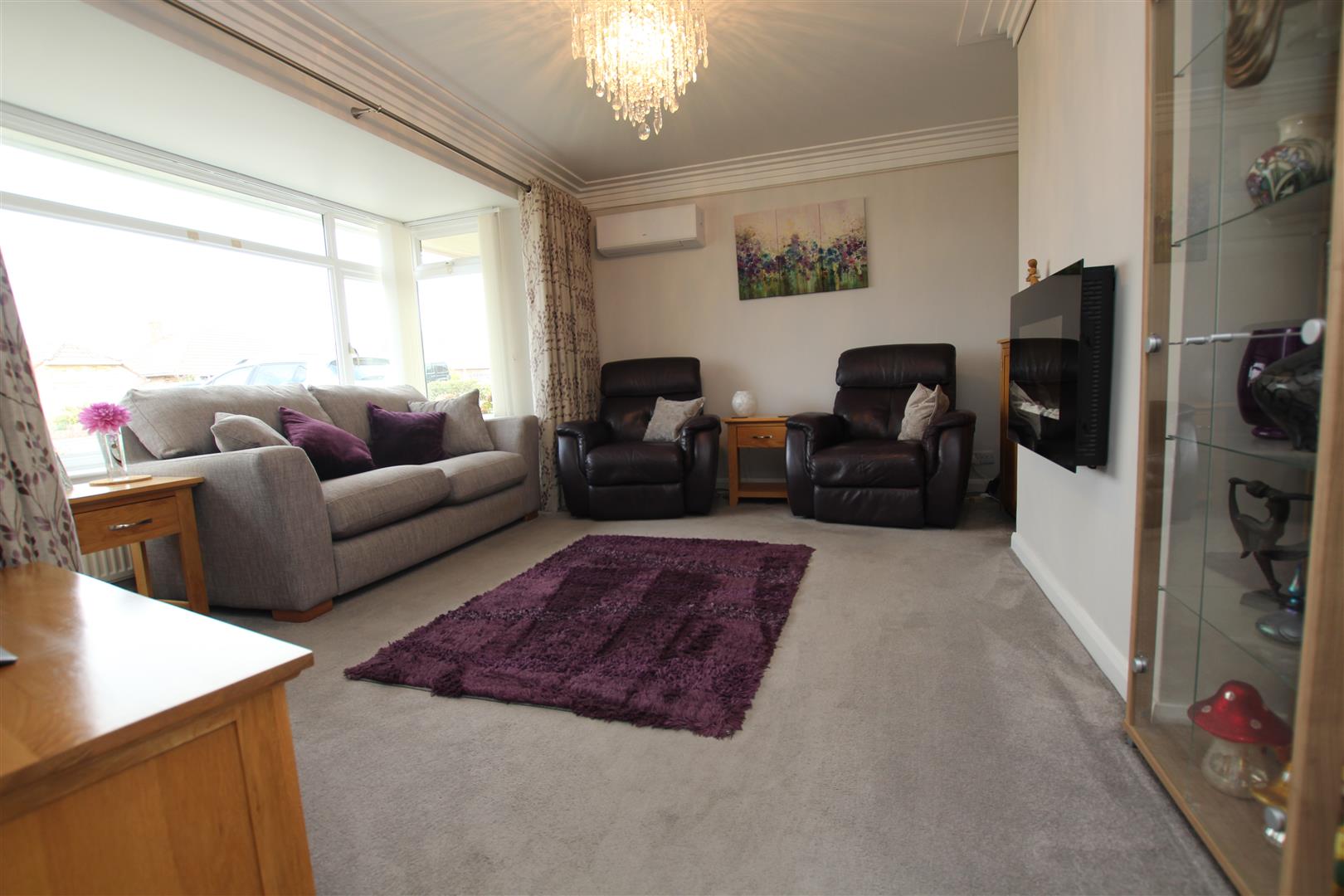 The room centres on a wall mounted electric fire.