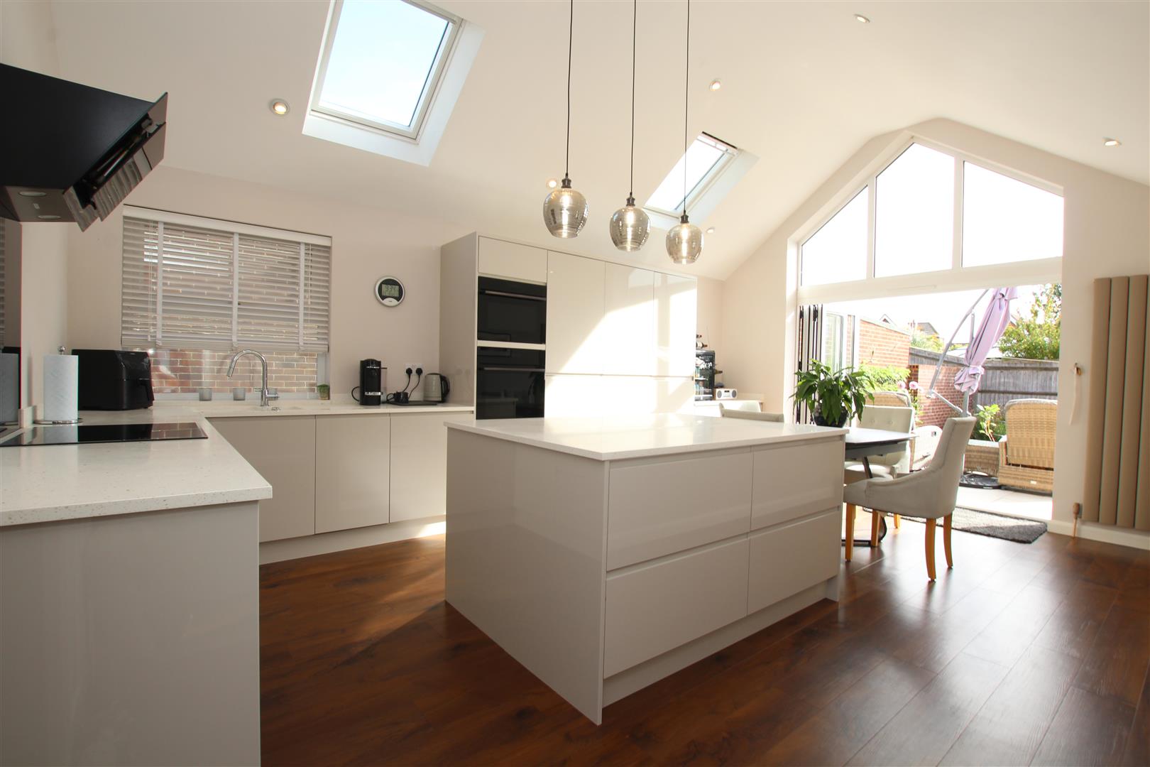 Aluminium double glazed bi-fold doors, give direct access onto the rear garden with apex glazing over.