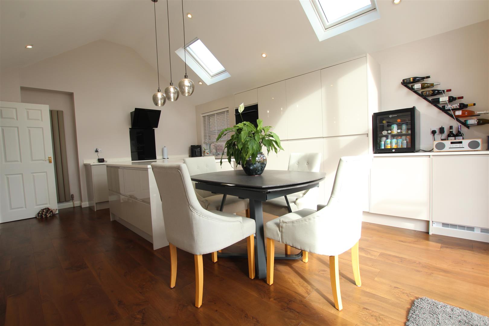 Smooth plastered vaulted ceiling, ten LED downlighters, 3 pendent lights, continuation of laminate floor covering from the entrance hallway. Two tall modern style radiators. Natural light is provided by two upvc 'Velux' windows.