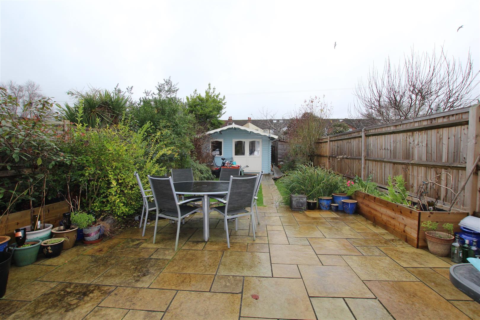 Stepping out on to an area laid to paving, the garden is enclosed by six foot timber panel fencing. A paved path leads down the garden to an area laid to lawn either side.