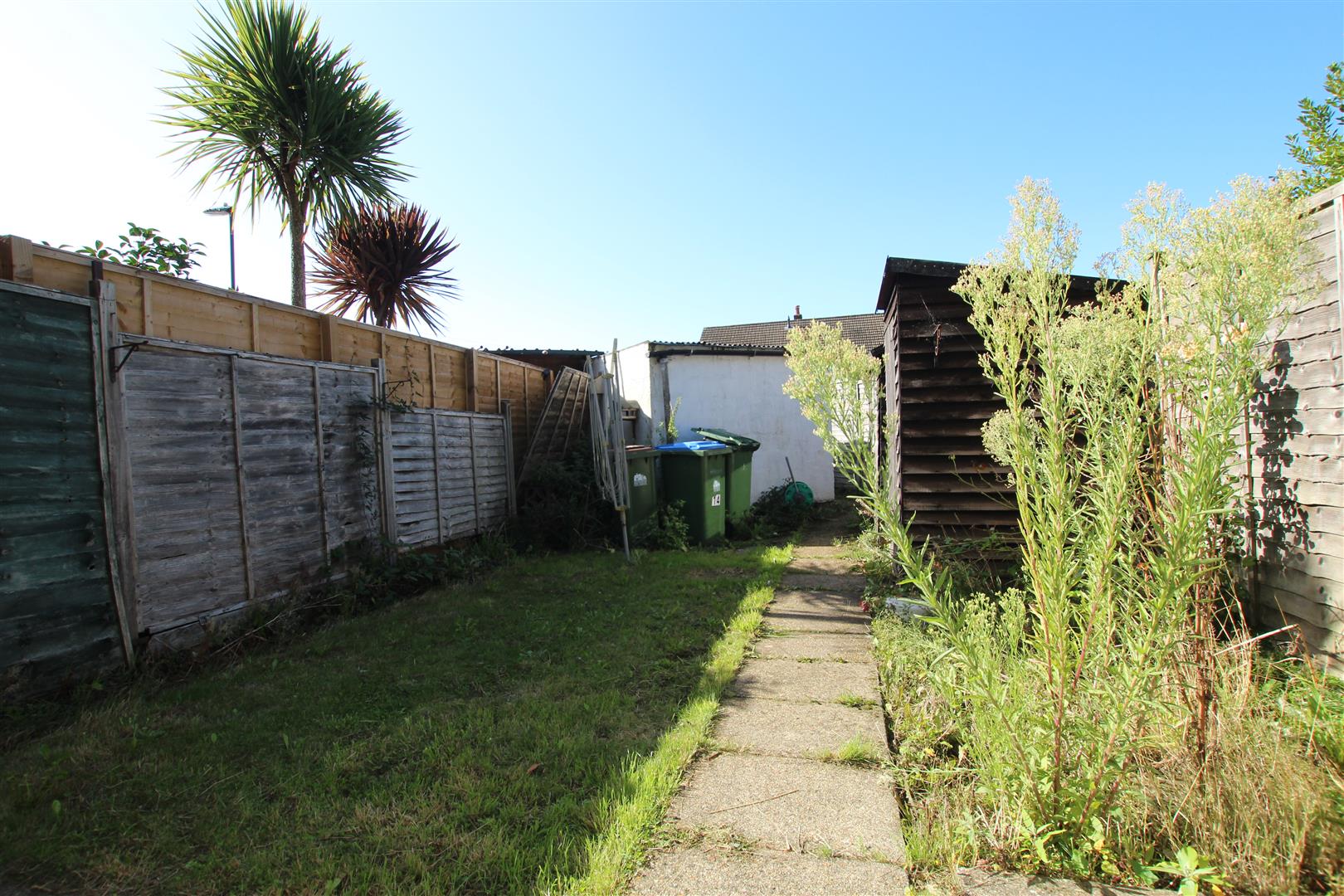 The rear garden is enclosed by timber panel fencing with a path leading down the centre, area of lawn to one side.